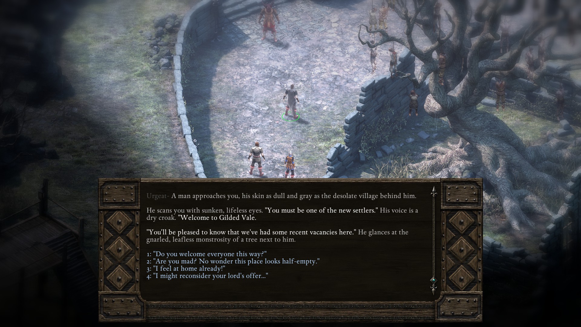 I do have to mention the writing. It is superb. Each character is very well flushed out, with a unique point of view on the game. Eder is wracked with guilt and questions about his brother, Aloth is going slowly insane, Kana is searching for a lost civilization, Durance redemption…The bad guy is also sympathetic in his own way, just like older games. There are very few black and white decisions here, and there are ripple effects on your reputation across the game world. Each person’s opinion adds more flavor and keeps the game very interesting. Even the finale twist (there’s always a twist) is well executed. A nice touch at the end is a Fallout-like storyboard of what your actions had as a consequence on the world. I’ll take a few weeks off then make another run I’m sure.