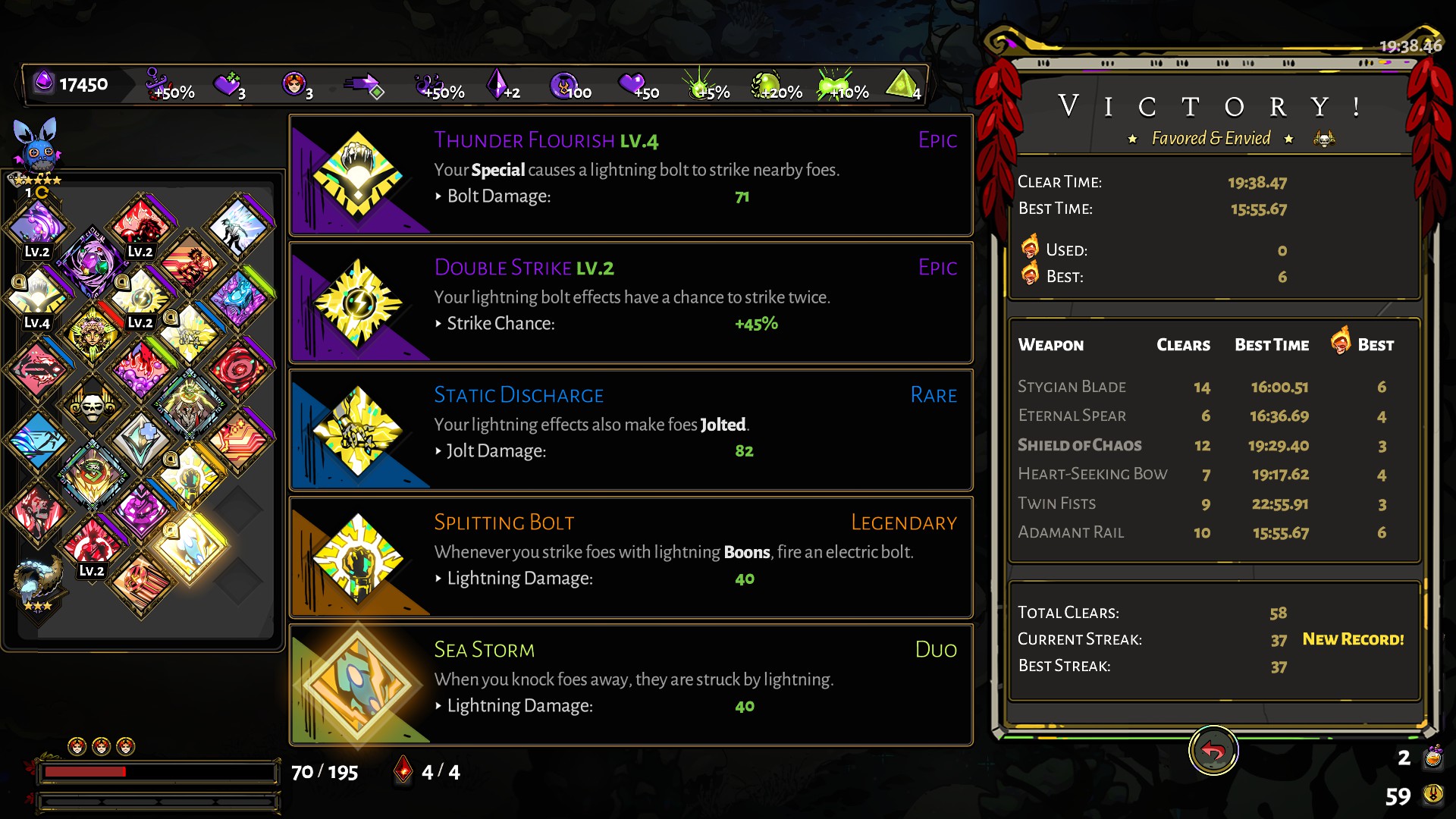 This run focused on the Zeus/Poseidon with the Zeus Shield. That shield aspect hits multiple times, and if you aim it right, it can hover over a boss. The actual shield damage is minimal (30) but it triggers a 71dmg bolt that has a 43% chance to hit twice. Each of those triggers a 40dmg bolt which can also hit twice. All the while I’m dashing to trigger Sea Storm for yet another 40dmg bolt (again hitting twice). It’s impressive to see.