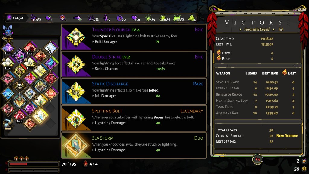 I wouldn’t say I’m in the optimization mode, since you know, RNG is RNG. Yet, I’m aware of every weapon’s strengths and weaknesses, as well as each god’s. Zeus for example, is great on fast attacks, but horrible otherwise. Artemis is best on slower weapon as the crit impacts can deal crazy damage levels. Dash-strikes reduce combo damage, but are twice as fast. Hermes speed boons can be crazy. Chaos boons need to take into consideration when you’re going to reach the boss.