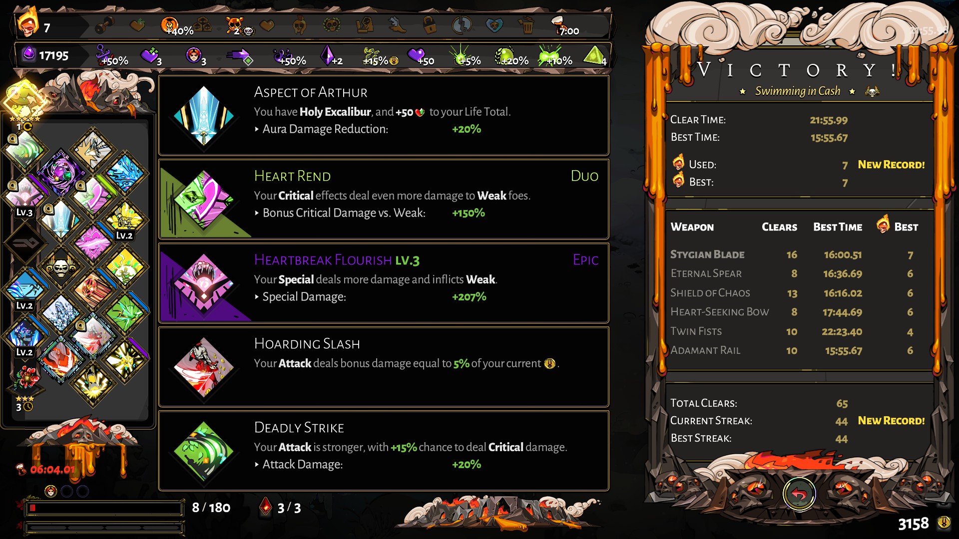 Heat levels give you more Diamonds, Ambrosia, and Titan Blood. Diamonds are for cosmetics (some quests), Ambrosia to max friendship, and Titan Blood to upgrade weapon aspects. You only get rewards for 1 Heat increase per weapon – repeating the same heat level only gives Darkness. In the picture above, that means I’ve successfully beaten Hades 41 times with increasing Heat levels. The rewards end at 20 heat (aside from a Skelly cosmetic/achievement at 24). You can get all these materials through the Broker in the Lounge, or buying them at the Styx/Charon shop.