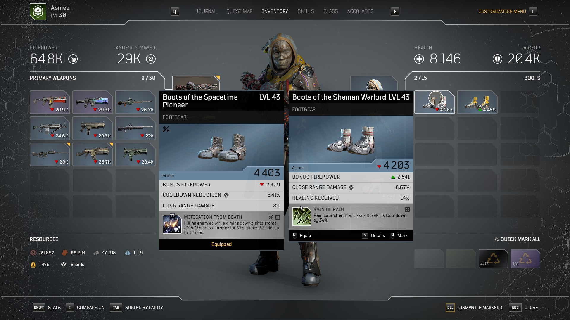 One bit I didn’t get into is the randomness on the base stats of an item. Armor and Firepower roll in a given range for any item, and a fairly significant amount as well (25% it seems). This isn’t anything earth shattering, and as a general rule doesn’t mean much for Armor. Weapons though…25% is a lot. The range is set on drop and isn’t related to item level. Purple will roll higher than blue though! It has nearly no impact on the quest portion of the game, but does mean a whole lot in expeditions.
