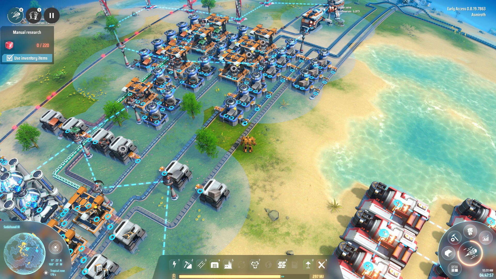 Every starting planet has the same sort of temperate layout. You’ll have water, trees, rocks, iron, copper, coal, stone and oil. The “difficulty” here is in the land allocation. You’re often put in a space that’s somewhat tight in terms of land/water ratio, and the first few nodes accessible are low volume. Starter area after all. That makes it important to scout ahead and find where the larger ore piles are located and the larger land masses. You’re going to need it.