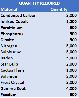 Currently, there are two “ultimate” crafts – Statis Devices and Fusion Igniters. Each is worth approximately 15m credits. The top row of that image is the base material required to start. With the exception of Mordite, each one can be farmed in raw form, though the pre-requisites to do so varies a tad. The metal & gas items have to be mined, while the plants need to be harvested.