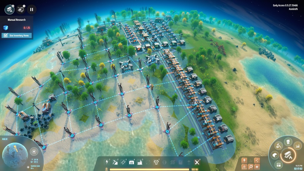 I’ll only briefly touch on the research tree, where you have a tree of growth, clearly defined from your first 30 seconds in the game. Alternate recipes are automatically unlocked, and should be exploited when you can find the extra material – they are always more efficient. You unlock crafting options, and you unlock character perks that improve performance (e.g. mine more efficiently, move faster, stack more things). The latter upgrades often have “infinite” upgrade options for those that want to expand their production chains across multiple star systems.