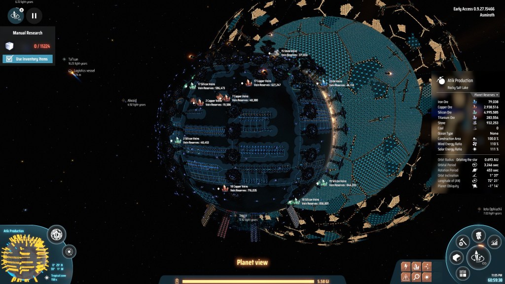 My recent playthrough is just a tad over 60 hours, and that’s shy under 400 white science per hour. To get to 1000, I’d need to move towards dedicated planetary hubs (the current production planet is simply full), and that would need about double my current harvesting power, and a much different energy relay system. The good news is that blueprints allow MASSIVE time savings. If I did it the original way, that’s close to 10 hours of work to lay it out. With blueprints, which can be planet-sized, it would be closer to 2. Recall that setting up a nuclear power plant in Satisfactory was 20+ hours of effort and it still wasn’t working.