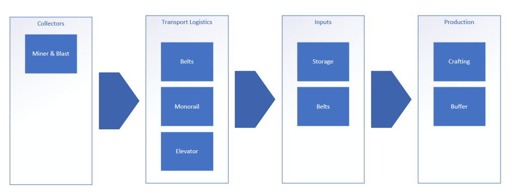 Factory games generally work better with a main bus to manage the distribution logistics. That is, the ability to move material around efficiently. Recall this visual from Satisfactory