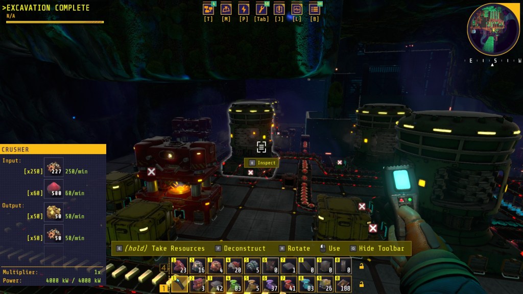 I like the concepts of Crushers, just like I did with the Blast model when it first came out. The practical application of Crushers naturally create significant logistical issues that the game currently doesn’t explain well enough, or provide the tools to effectively manage. More specifically, the lack of a practical sink mechanic really shows up here. Blast incineration is the only method, but you need to build a dedicated machine per item type, which basically means a few dozens machines where a single one should suffice. This isn’t a math problem, it’s a mechanical one, meaning there’s no readily available solution.