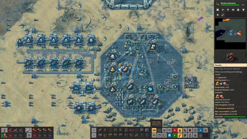 After you solve the fish farm part – now it gets complicated. You need to create material in the trench, which has no power sources. Maraxsis went through some design changes and the salt reactor is both simpler and more complicated than before. It’s a nuclear plant on steroids, and you need to pipe the supercritical steam down to the trench to power a specialized turbine. This also means you need to build a patrol for the submarine to move material from above to below and back again. This requires ports and is quite similar to train logistics – if a bit more finicky. This unlocks the hydro science – which has 5 types of quality ingredients to manage, so you need 5 production plants. Feels like details at that point. Project Seadragon opens up and allows you to build rocket launch pads! Finally an exit!