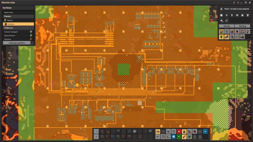 On another, there are some core balancing issues that still seem present. Great to see Freight Elevator improvements on throughput, because splitters and multiple elevators was a pain – there are no other vertical belt options. The game still keeps splitters behind alternate research paths (this feels QoL to me), the 3rd row inserter is way too late in the tree (on the edge of QoL and bad design), and power management still feels painful until you build acres of solar panels (there wasn’t occlusion before, so a tower of panels actually works).