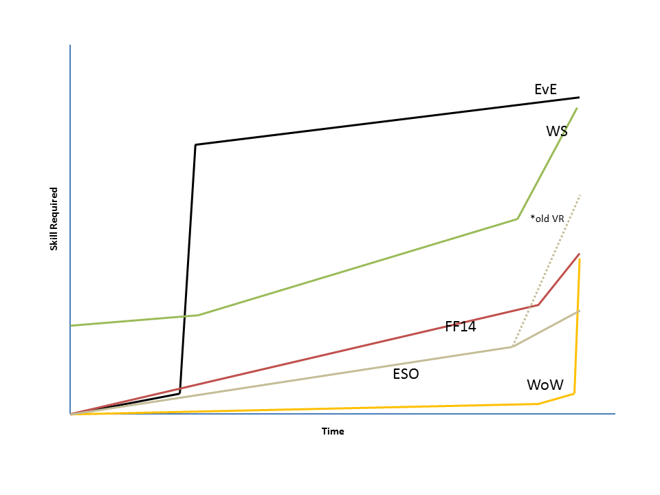 What I did here was map the player skill required to complete tasks, assuming a time investment. The skill portion is relative between games, where EvE is certainly the most challenging. The remaining themeparks are ranked in difficulty, based on my play. Over each in particular now.