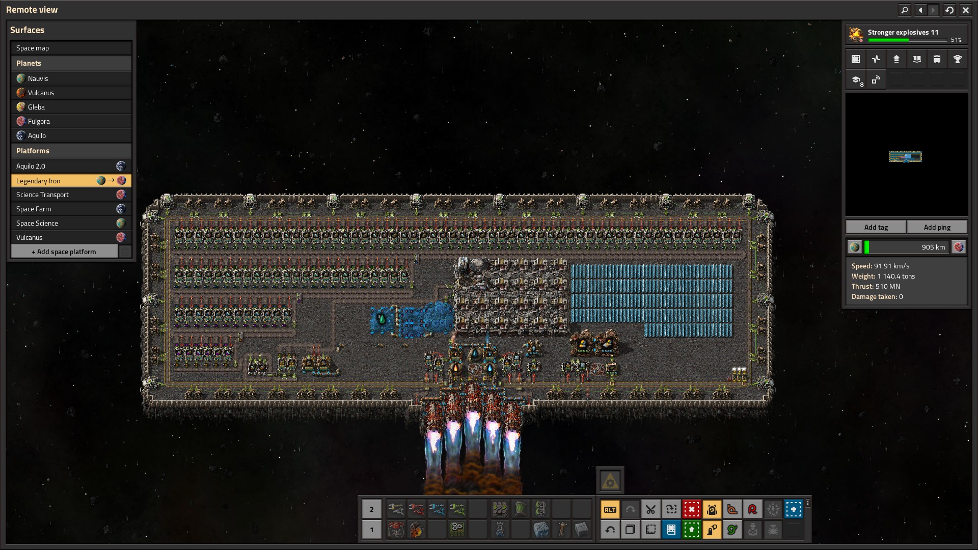 This is an interesting decision point, as the value of Nauvis drops massively once you’re done with Gleba, and becomes only useful for research and biter eggs when you complete Aquilo. As I plan to build a legendary factory on Vulcanus, it does make sense to keep Nauvis running for a little while as it’s my ship building yard (no meteors). Building any ship requires a few truckloads of steel, and the absolute best way to get that is through Foundries – from less than 5/s to over 40/s.