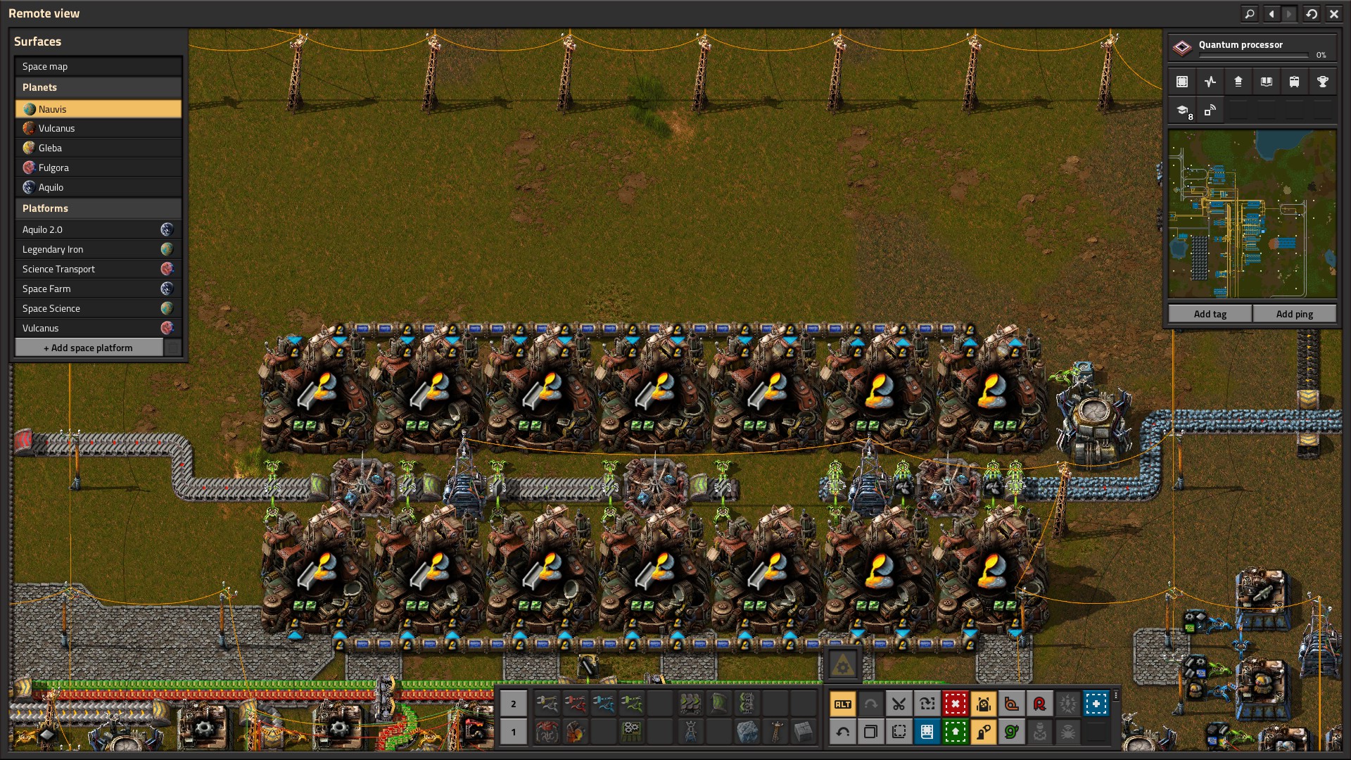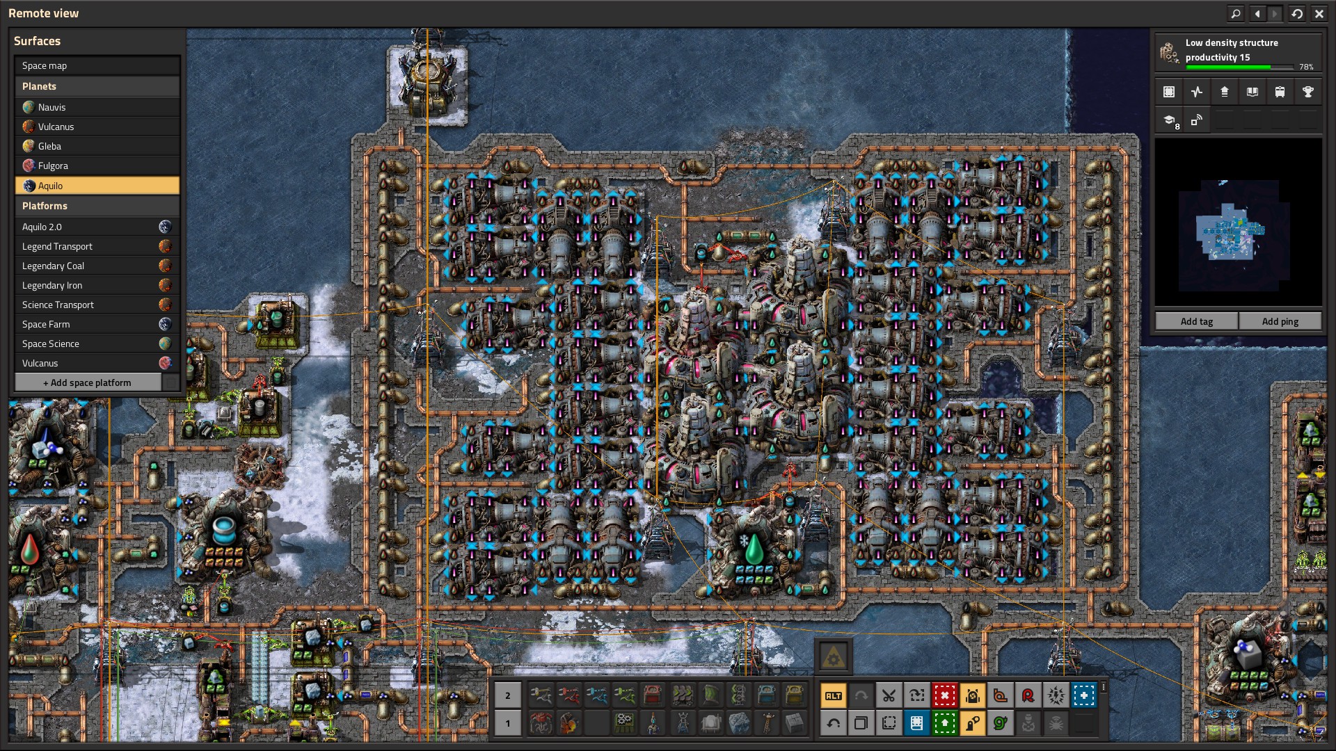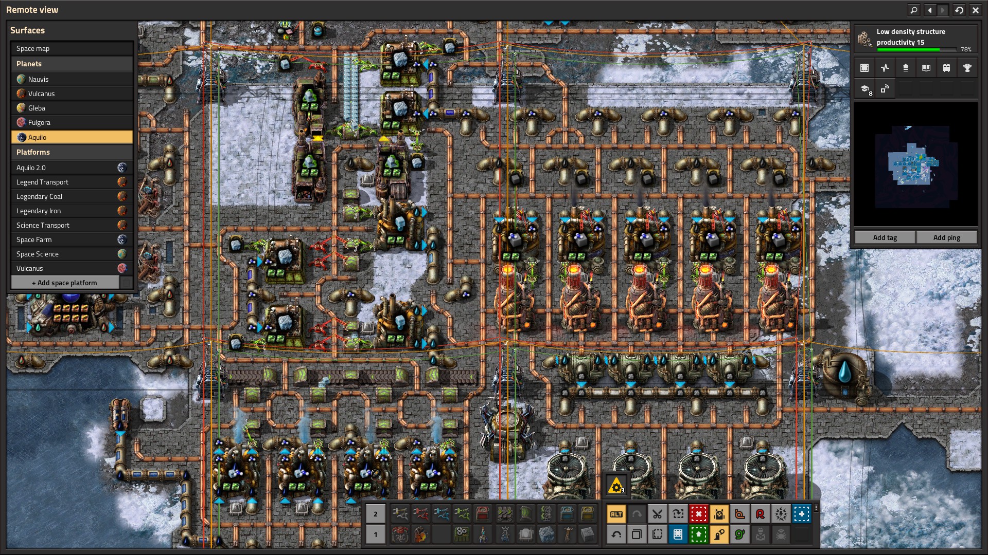 This is the hardest part of Aquilo as you’re likely not bringing the right amount of stuff with you. Aquilo has oil and 2 other gases that are specific to Aquilo tech. Nothing else. It’s also so cold that everything needs a heat pipe nearby to function, robots take 5x the power, and solar power gives 1% return. The first 10 minutes or so of Aquilo is basically survival with the tools you brought. I did mention in the past that I parked a space farming platform above Aquilo – it gives iron, copper, sulfur, coal, carbonized coal, calcite, and ice.