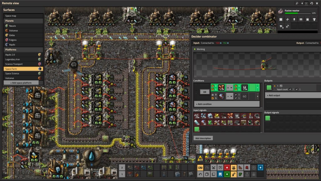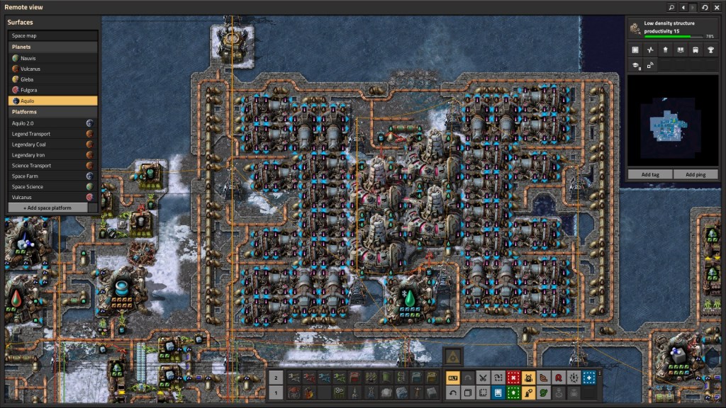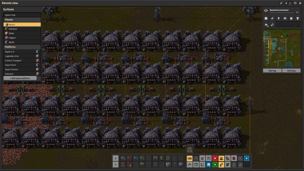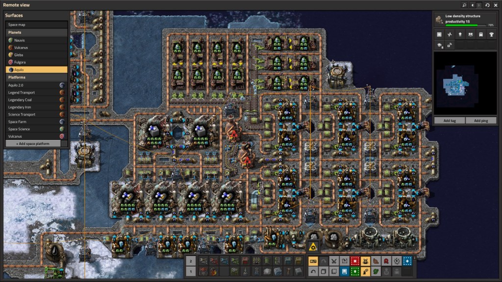 Overall, I really do like the puzzle aspect of Factorio. Making the numbers go up while your investments is rewarding. Each planet brings a new set of variables to adjust and there are optimal solutions for each. I still think Aquilo’s bar for entry is too high as you can’t fail-forward. I think that the legendary ‘farm’ is a red herring for many players, and one that could have been implemented differently or behind a later research gate. There are only two meaningful quality types – normal and legendary. Everything else is simply fodder along the chain.
