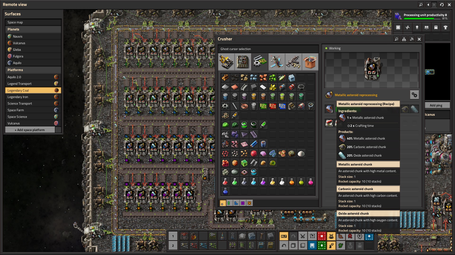 Using Quality Modules (the best you can), you recycle rocks with the hope of getting a higher quality result. Do it again for uncommon, rare, and epic rocks and maybe you get one legendary from it. Crush that legendary stone and get either iron/copper/calcite (one ship) or coal + sulfur (another ship). I have a future post on why you want to invest in legendary quality modules – short answer, they are 100x more effective.
