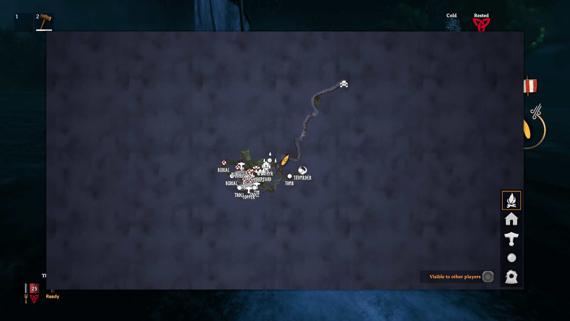 The beauty of swamps and plains is that they are coastal biomes. From your ship you can get a general sense of what’s in the biome, and from the map, the general size. Mountains, not so much. They never really reach the shore, and you often have no idea how big a biome is because of it. Due to multiple learning sessions (i.e. deaths) I’ve come to the habit of building a portal on shore, and then hauling up the resources to build another on the mountain, if need be. I run up that hill (Elkthyr power!), take a quick look at how big the place is, then plop down a portal if it’s going to take a bit. I need to be full health to bother exploring, cause a single quick hit from a golem, or a tandem of wolves can be an unlucky end.